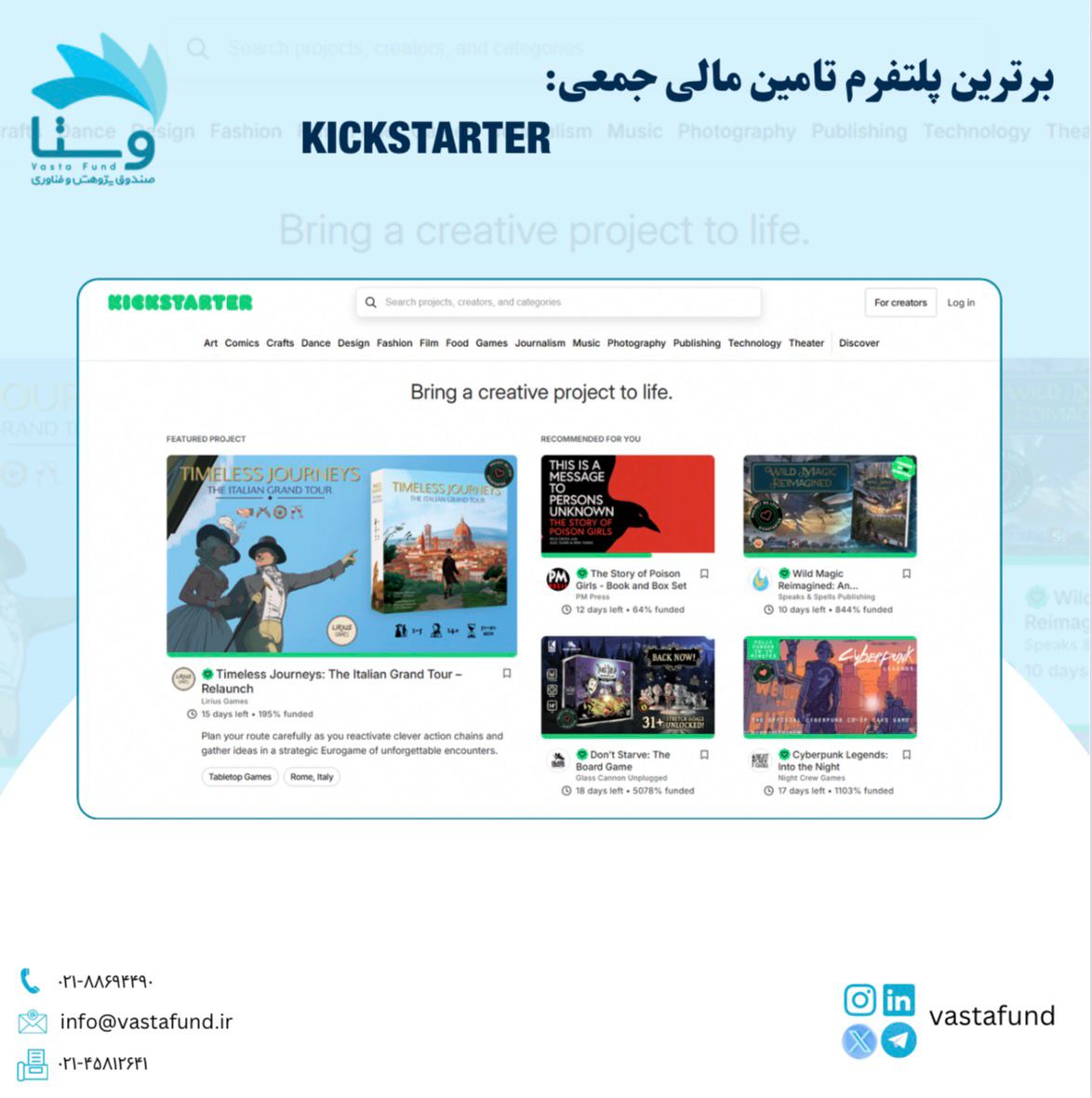 ۱) Kickstarter:یکی از بهترین پلتفرمهای جمعآوری پول به صورت آنلاین است که مبتنی بر پاداش بوده و از زمان راهاندازی آن در سال ۲۰۰۹ تاکنون،