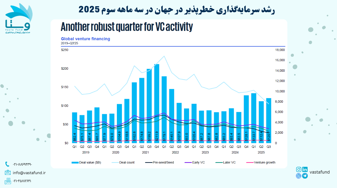 سرمایهگذاری خطرپذیر در سه ماهه سوم 2025 در جهان به 120 میلیارد دلار رسید که نسبت به 112 میلیارد در سه ماهه دوم، رشد قابل